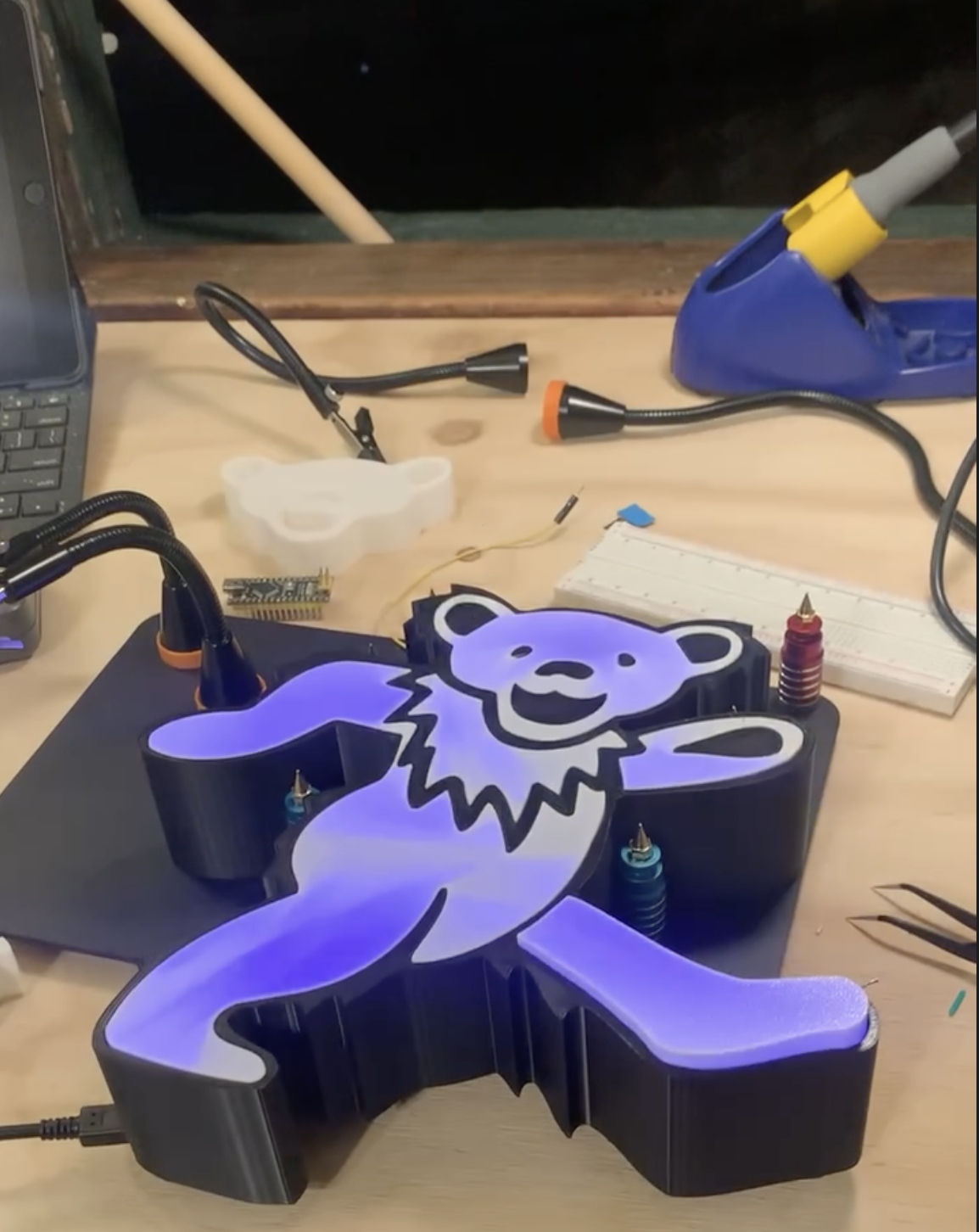 Traced the bear out in Fusion 360, printed it. Used FastLED and Arduino to program a WS2812B led strip which I glued inside.